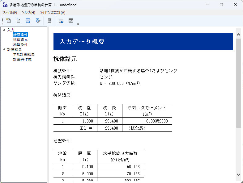 杭頭に外力(杭軸直角方向力および杭頭モーメント)が作用したときの杭体の断面力(水平変位量δ,たわみ角θ,曲げモーメントM,せん断力S)を求めるものです。多層地盤や杭体の断面変化を考慮した単杭の断面力を容易に算出できます。