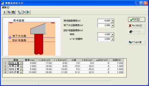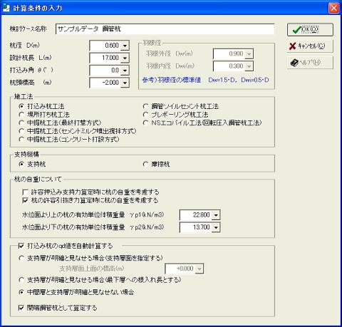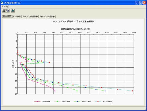 道路橋示方書・同解説Ⅳ下部構造編(平成14年3月)に準拠した杭の支持力算定プログラム。支持杭および摩擦杭の許容支持力の算定が可能。最大周面摩擦力度や極限支持力度の値は、施工法別(打込み杭工法、場所打ち杭工法、中掘杭工法(最終打撃方式)、中掘杭工法(セメントミルク噴出攪拌方式)、中掘杭工法(コンクリート打設方式、鋼管ソイルセメント杭工法、NSエコパイル工法(回転圧入鋼管杭工法))に標準的な値を算出します。杭径や杭長の選定時に便利な杭の支持力検討グラフを簡単に作成できます。しおり付きPDF文書エクスポート機能。Word文書エクスポート機能(*)