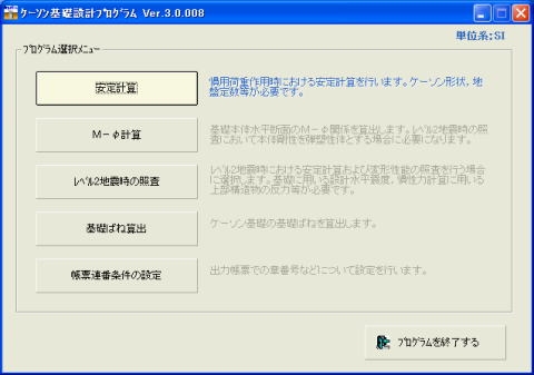 道路橋示方書(平成14年3月)に準拠したケーソン基礎の安定計算プログラム。常時,暴風時,レベル1地震時およびレベル2地震時の安定照査を行う。根入れの浅いケーソン基礎を直接基礎として設計する場合にも対応。